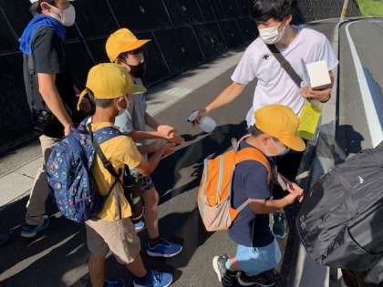 バスに乗ります。もちろん消毒をします。