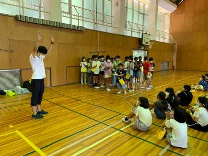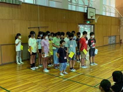小鈴谷小学校の学校紹介を全員で行いました。元気いっぱいに校歌も歌いました!