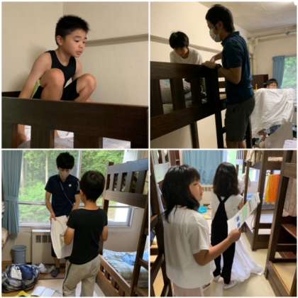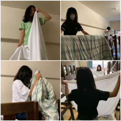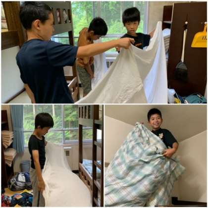 おはようございます! 公開日 2021/08/05 更新日 2021/08/05 5 年 8月5日(木) おはようございます!さわやかな朝を迎えました。 部屋のみんなで協力してシーツをたたんだり、身支度を整えたりしています。今日も頑張りましょう!