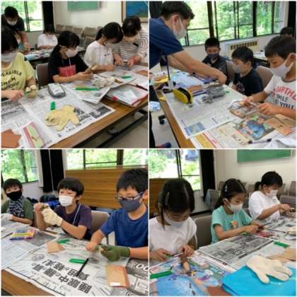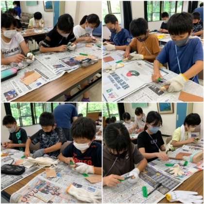 木のボールペン作りに取り組んでいます。ナイフを使って木の皮を削ります。慣れないナイフに四苦八苦です。ケガをしないように気をつけて!