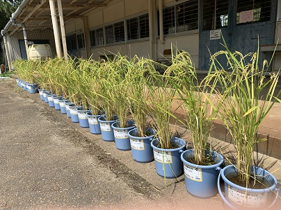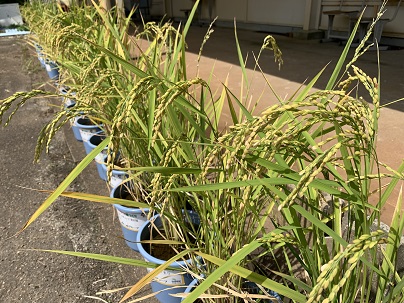5年生の稲です。だんだん色もついてきました。稲穂の状態を見ようと近づいてみると・・・