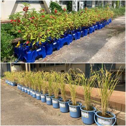 3年生のホウセンカ、4年生のヘチマ、5年生の稲の様子です。夏休みのはじめの頃と比べると、ずいぶん成長していたり、色が変化したりしています。青々とした色から、黄色や茶色へと変化し、夏から秋への季節の移ろいを感じます。