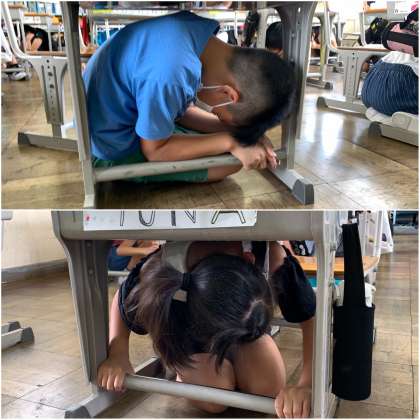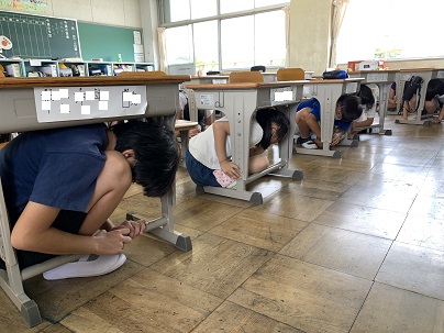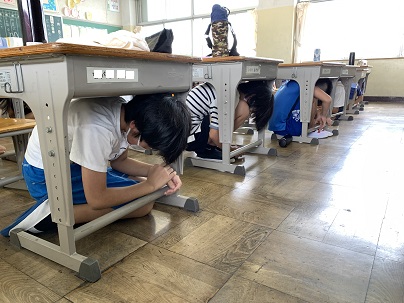 本校でも、3時間目に地震避難訓練を行いました。いざという時に、自分の命は自分で守ることができるように、繰り返し訓練を行っていきます。