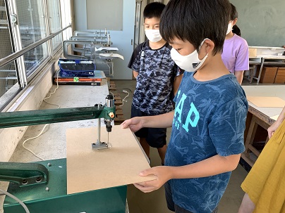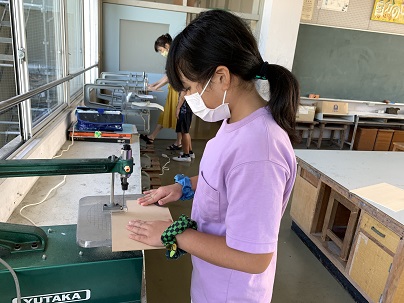 5年生の図工では、糸のこ盤を使って作品の制作を進めていきます。きょうは、直線、直角、曲線の切り方を各自で練習しました。密になることなどを防ぐため、数人ずつに分かれて、図工室で練習をしています。