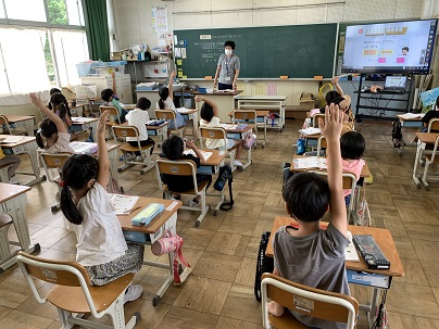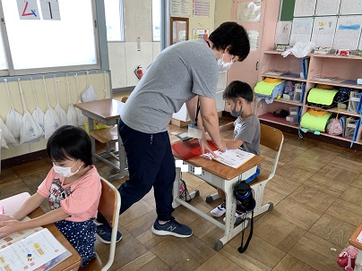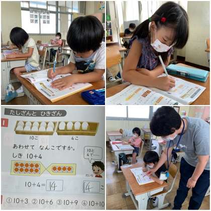 合わせていくつになるかな?10をこえる数の計算です。今日は、たしざんの学習をしました。できた子は、先生に○をつけてもらいます。先生に大きな○をもらって、とってもうれしそうです。