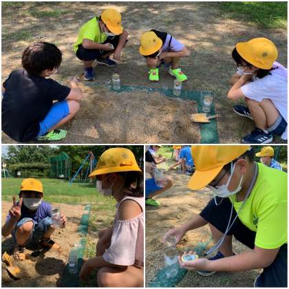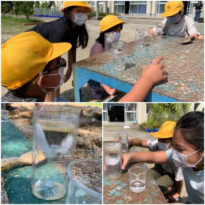 昨日作った実験器具を使って、実験をしました。運動場と砂場の砂の水のしみこむ速さを比べます。ビーカーに決まった量の水を用意して、ストップウォッチを使って時間を計っています。結果はどうでしたか?