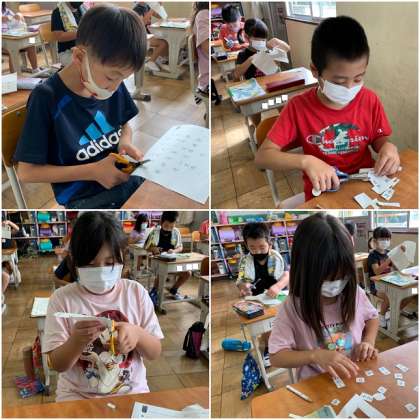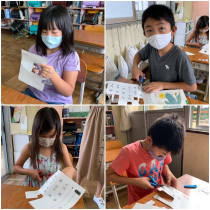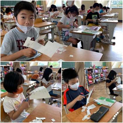 プリントから感じカードを切り取って、なかま分けをします。どんななかまに分ければよいのでしょうか?みんな頑張って切り取っています。切り取ったあとの活動が、大切ですよ。なかま分けはできたかな?