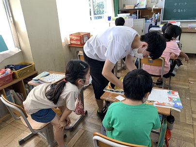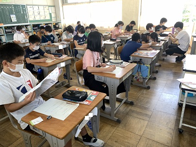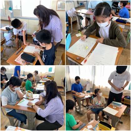 〜に入る部分を考えて、プリントに記入しています。お父さんやお母さん、兄弟や親戚などいろいろな人について考えています。
