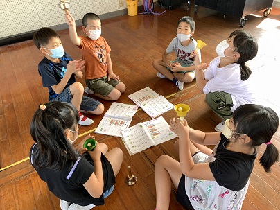 ハンドベルを使って「かえるのがっしょう」を演奏します。今日は、グループに分かれて練習をしました。みんなでリズムを合わせて、頑張って練習をしています。最初から最後まで、間違えずに演奏をすることができて大喜び!みんなとっても上手でしたよ。