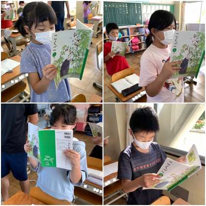 がまくんとかえるくんのお話です。今日は、授業の初めに最初の場面の音読練習から始めました。姿勢に気を付けて読むことができる子がたくさんいます。みんなしっかりと読んでいます。