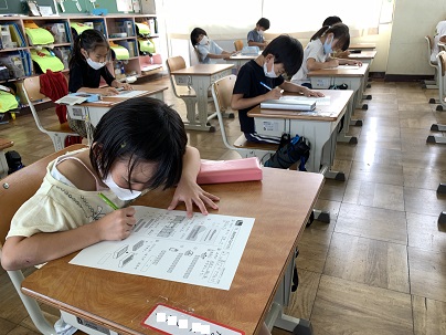 かさくらべの学習をした後に、「おおきさくらべ」で学習してきたことを復習するためのプリントに取り組んでいます。大きさをそのまま数量で答えるのか、数量を比較して記号で答えたり、順番で答えたりするのか、問題の答え方に気を付けなければなりません。これも大事な勉強です。