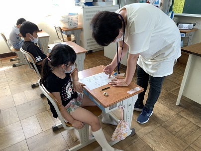 できた子は澤田先生に見てもらいます。大きな○をもらってニッコリです。