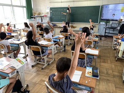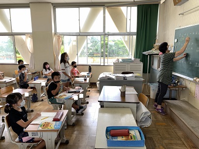先日紹介したまとめて考えて計算する仕方の学習をしています。問題を解いた後に、どうやって計算したのか、黒板の式を見ながら説明をしました。どうやって考えたのか、きちんと言葉で説明できることも大切です。