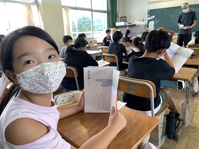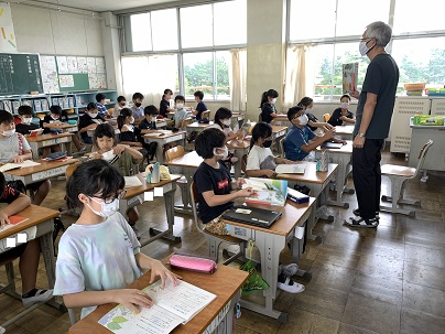 新品の教科書に折り目を入れています。森川先生の指示を聞き、折り目となる線に沿って丁寧に折っています。新しい教科書を手に、気持ちも新たに学習に取り組もう!