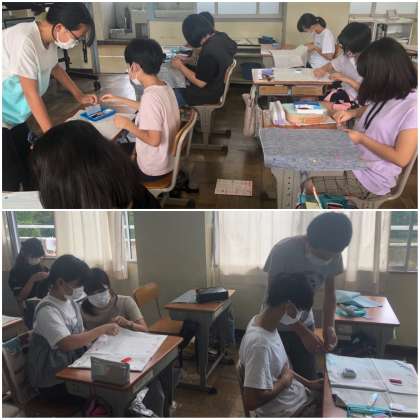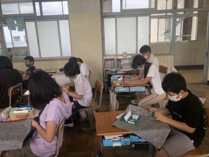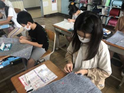 家庭科の学習でトートバッグ作りが始まりました。今日は、チャコペンで印をつけ、しつけをつけるところまで行いました。来週はいよいよミシンに取りかかります!