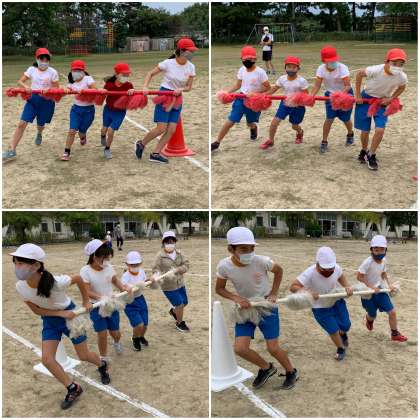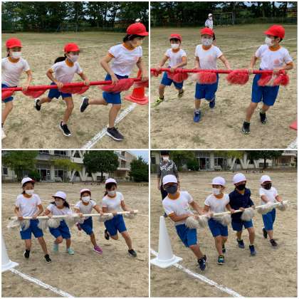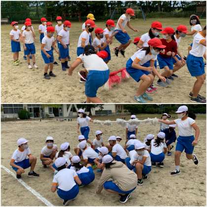 運動会に向けて、ペア種目の練習が始まりました。3・5年生ペアは、台風の目を行います。5年生が3年生を挟む形で棒を持ちます。5年生が3年生をしっかりリードしてくださいね。