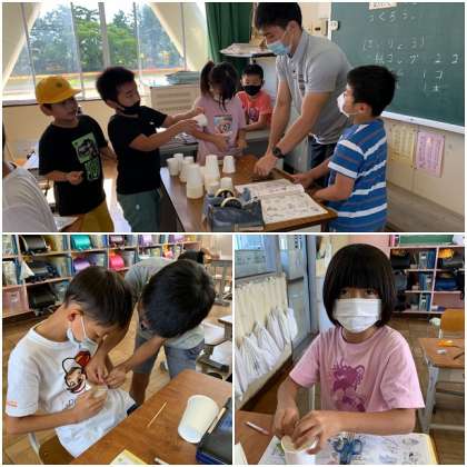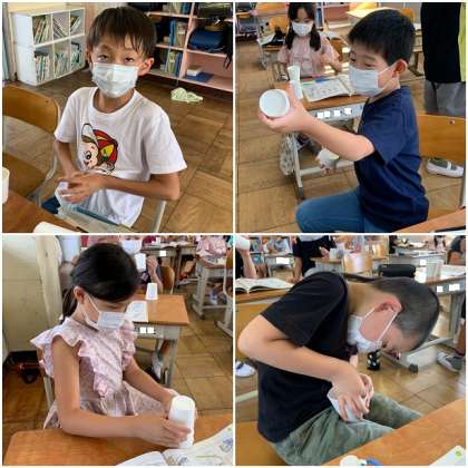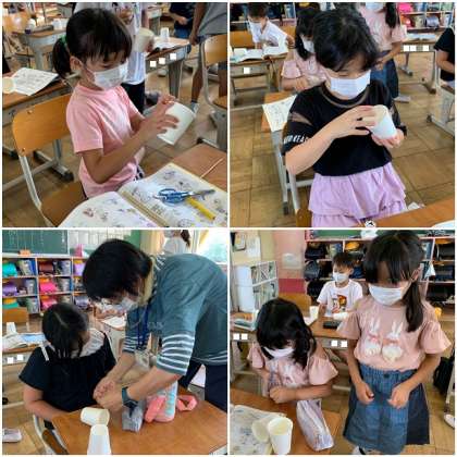 紙コップと輪ゴムを使って、コップが飛び出すように飛ぶおもちゃ、ぴょんコップを作りました。紙コップに穴を開けたり、竹ひごを切ったりと、細かい作業にも頑張って取り組みました。困っている子がいたら、助けてあげる姿も見られました。できあがったおもちゃをとってもうれしそうに飛ばして遊ぶ2年生のみなさんです。