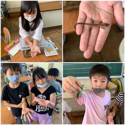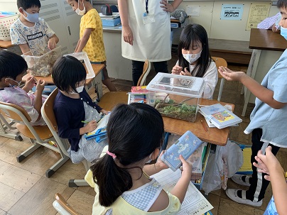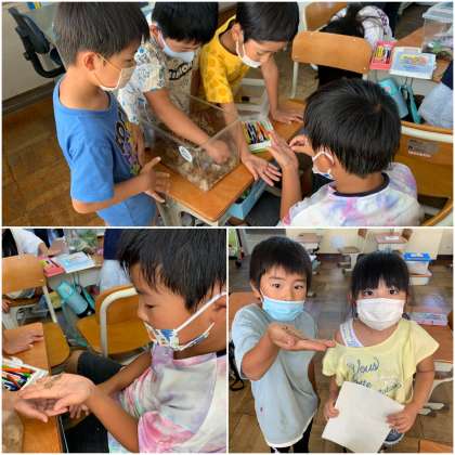 生活科で虫を飼う学習をしています。自分の虫かごや水そうに虫を飼っています。今日は、虫を飼ってみて分かったことをプリントにまとめていきます。