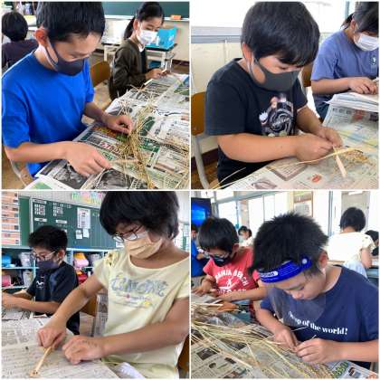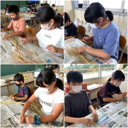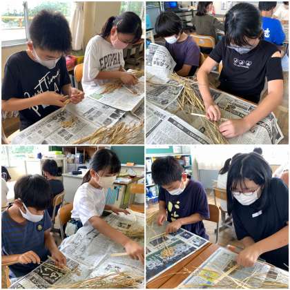 刈り取って干した稲穂からお米を収穫します。今日は、脱穀ともみすりをしました。まずはじめに、稲穂から割り箸を使って脱穀をしました。勢いよく脱穀をすると、お米が飛び跳ねて飛んで行ってしまいます。貴重なお米です。みんな慎重に脱穀をしています。いったいどれくらいの量のお米になるのでしょうか?