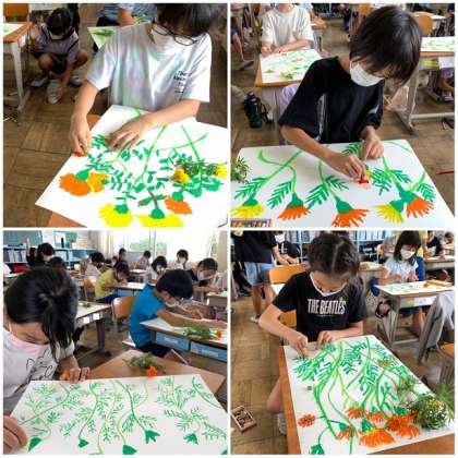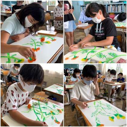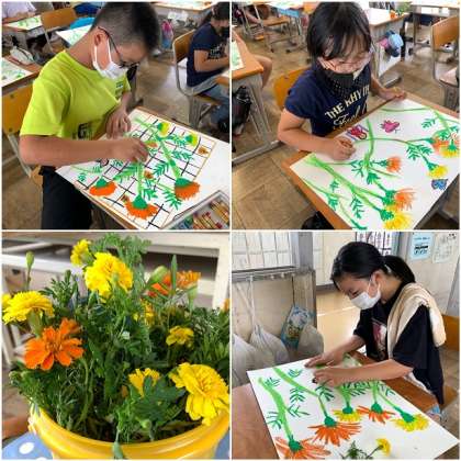 マリーゴールドを描き、そのまわりで遊ぶ自分を想像してさらに描きます。