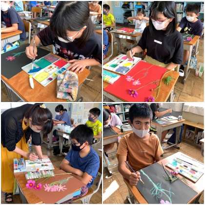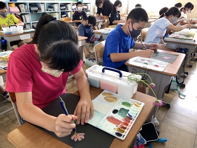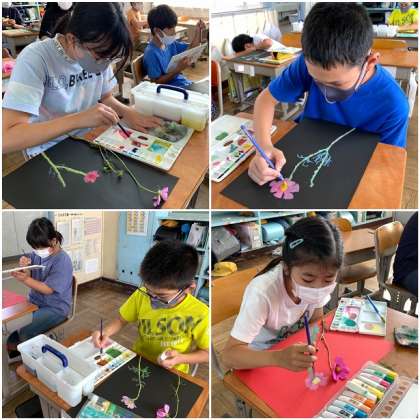 コスモスを実物そっくりに描いています。筆づかいや色の混ぜ方などに気を付けています。みんなとても上手ですよ!
