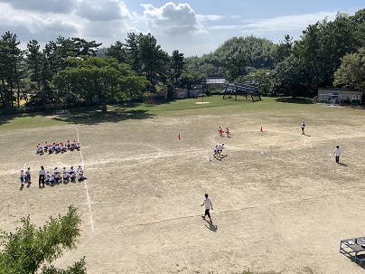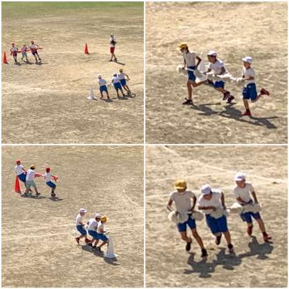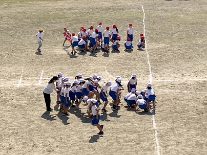 3・5年生ペア種目「台風の目」の2回目の練習です。暑さにも負けず、頑張っています!