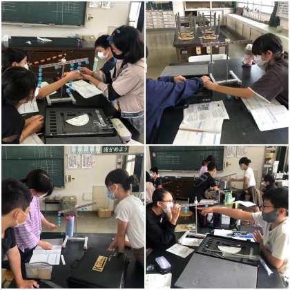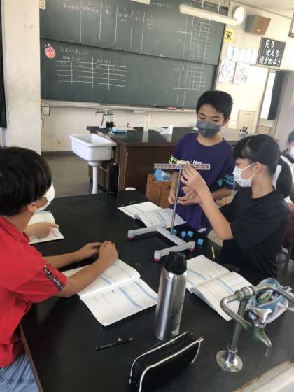 てこの実験をしました。水平になるときのおもりの重さと支点からの距離について、グループで実験をしました。