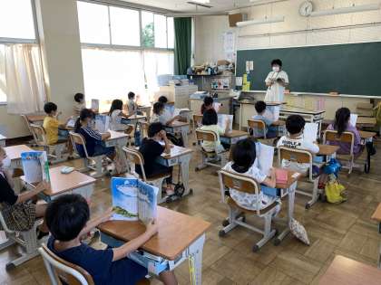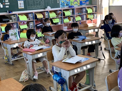 「くじらぐも」を元気よく音読する声が聞こえてきます。身振りを入れている子もいます。今日はとってもいい天気。くじらぐもはいないようです。運動会もいい天気になるといいなあ。