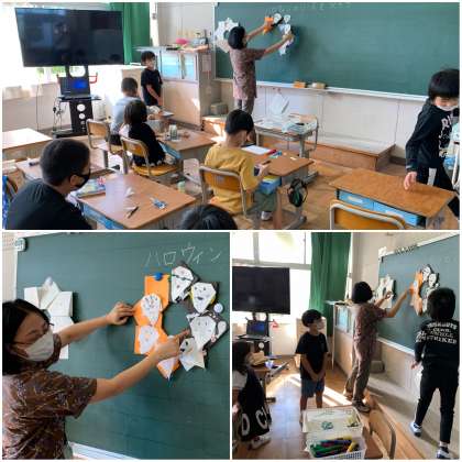 ハロウィンのリース 公開日 2021/10/14 更新日 2021/10/14 すずらん 10月14日(木) ハロウィンのリースを作りました。ひとりずつおばけを作って、それをつなげるとリースになります。上手にできました!
