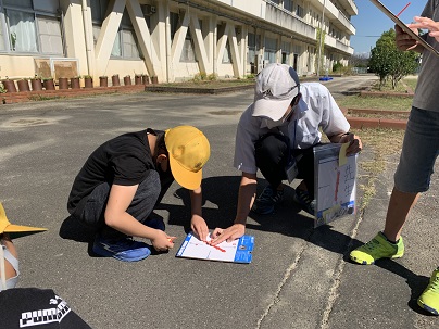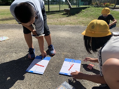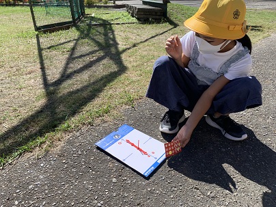 午前、正午、午後に、かげの向きと太陽の向きを観察しました。