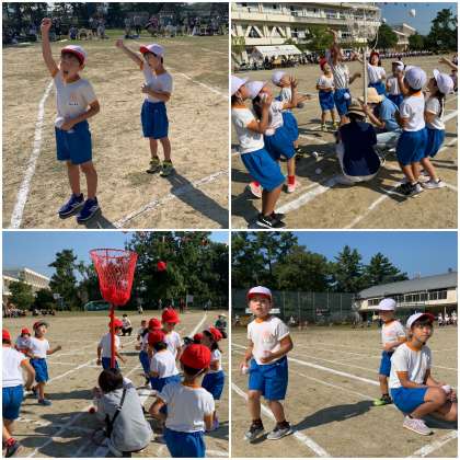 1年生はかごの下から、6年生は円の外ら玉を入れます。1年生と6年生が協力して玉入れをします。