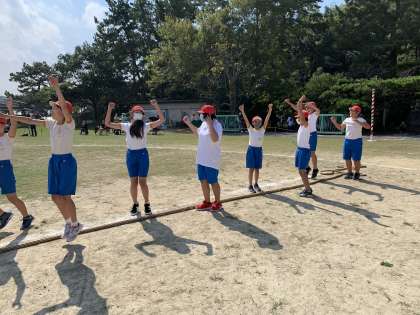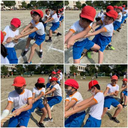 高学年の綱引きは、初めて行います。高学年は赤組の勝ち!