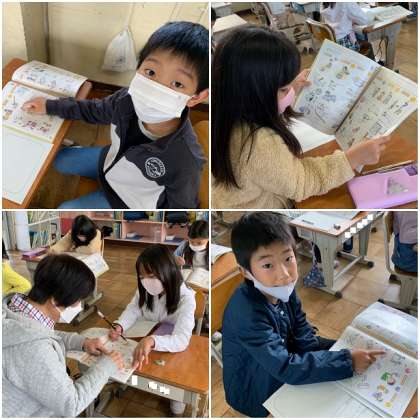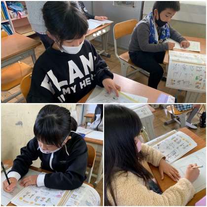 これまでにいくつかのおもちゃを作ってきました。これまで作ったおもちゃや教科書に載っているおもちゃを参考に、自分の作ってみたいおもちゃを考えています。おもちゃの名前や材料、完成した図を書いています。どんなおもちゃができるかな?