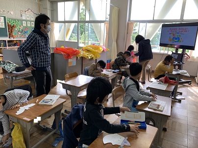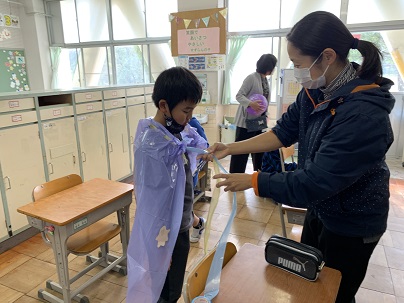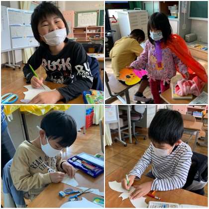 ハロウィンパーティーに向けて準備中。マントやおばけをがんばって作ってます。楽しみだね!