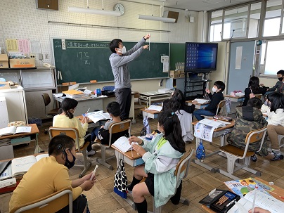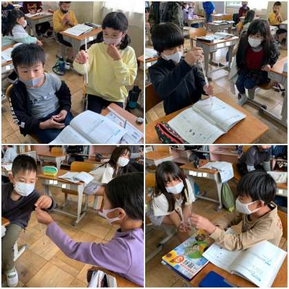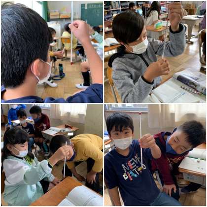 日なたの地面が日かげの地面より温かいのは、太陽の光によって地面があたためられているからなのかどうかを調べます。そのために必要な道具が温度計です。温度計の使い方や扱い方のついて学習しました。温度を測るときには、液の先の高さと目の高さを合わせなければいけません。2人1組で温度計を読む練習をしています。