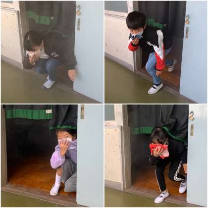 高学年の皆さんは、4時間目に濃煙体験を行いました。火災では、煙に巻かれたり、有害なガスが発生して人命が奪われることが多くあります。煙が発生すると視界が悪くなり、呼吸もしづらくなります。こういった経験を擬似的に体験するために濃煙体験を行います。口をハンカチなどで守りながら腰をかがめて移動して、部屋を脱出してます。部屋の中を移動するのもなかなか大変です。