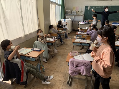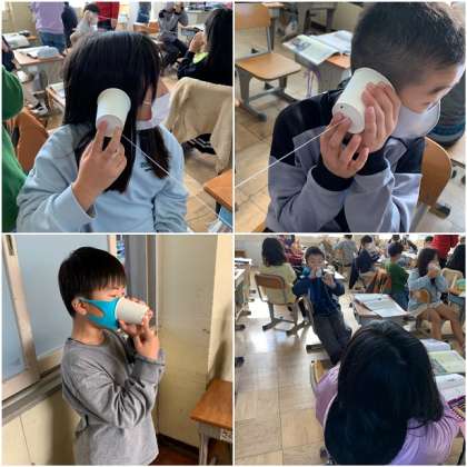 糸電話では、音が伝わるとき、話す方の紙コップの震えが聞く方の紙コップに伝わることを実験で確かめています。声の大小によっても震えの大きさが変化することを確かめています。友だちの声がしっかり伝わってくるので、みんなとても楽しそうに実験に取り組んでいます。