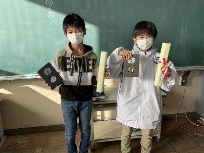 創意工夫作品展の入賞と野球大会、空手の大会の表彰を行いました。表彰された皆さん、おめでとうございます!
