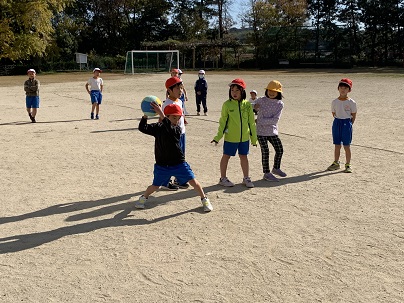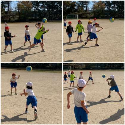ボール遊びでドッジボールをしました。ボールの取り合いになったら、すぐにじゃんけん。勝っても、負けても恨みっこなしだよ!