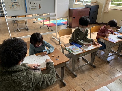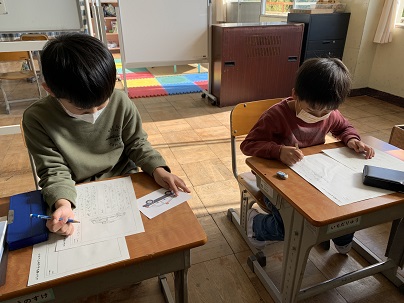 じどうしゃずかんの清書に取り組んでいます。みんな頑張って書いています。パトカーの絵も上手だよ!