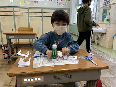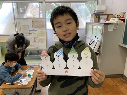 冬の飾りで、雪だるまを作りました。みんなかわいい雪だるまを上手に作りました。できばえに大満足です!