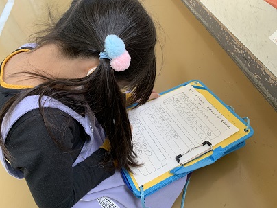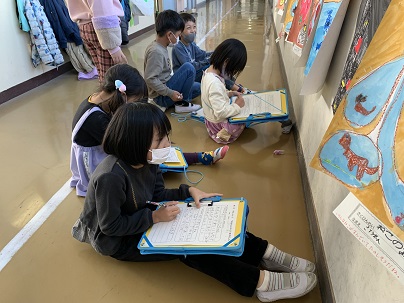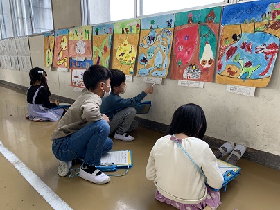 頑張って描いたお話の絵の鑑賞会をしました。友だちの絵のいいところを探して、プリントに書きます。中には、裏にまでたくさんいいところを書いている子もいます。みんな上手だね!