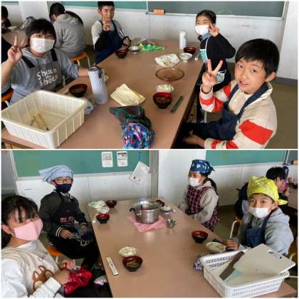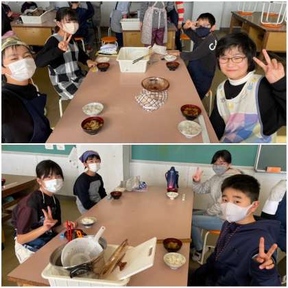 ご飯とみそ汁ができあがりました。 グループごとに「いただきます!!」