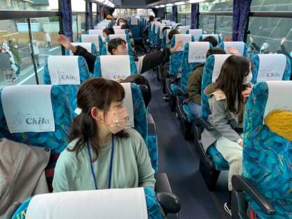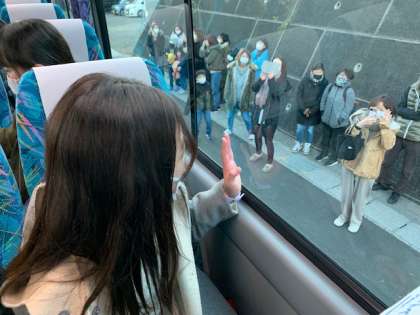 バスの中から、おうちの方に手を振ってます。気をつけて行ってきます!