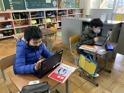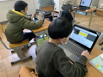 教科書の宝島の地図を見て、冒険の内容を想像して、物語を書きます。どんな動物に出会ったり、どんな事件が起こったりするのでしょうか。chromebookを使って、出来事を順番に付箋に書いて、構成を考えています。