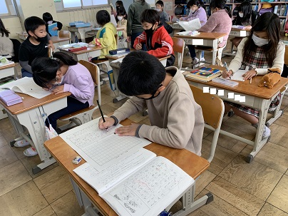 教科書の挿絵を基にお話を考えてきました。いよいよお話もできあがり、頑張って清書しています。教室に入っていくと、たくさんの子が「読んで!」と声をかけてくれます。お話では、いろいろな場所で大冒険が繰り広げられています。子どもたちの豊かな想像力に感心します。