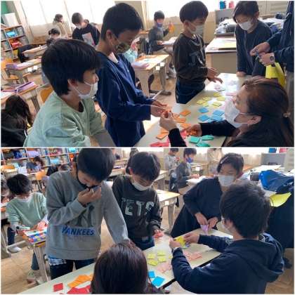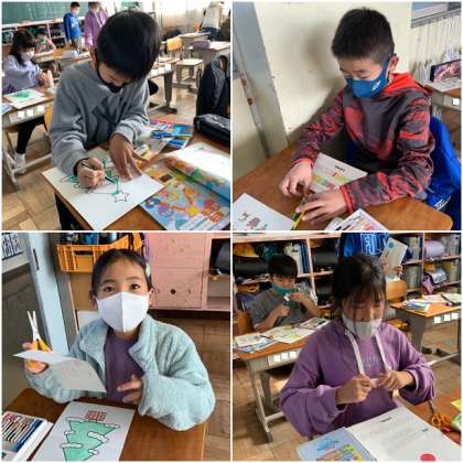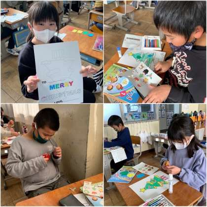 昨日覚えた形の名前を使って、ほしい形の画用紙を先生からもらいます。そのカードも使って、今日はクリスマスカードを作りました。クリスマスツリーに飾りを貼ったり、色を塗ったりして、みんな楽しそうにカード作りに取り組んでいます。カードは誰に渡すのかな?
