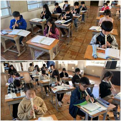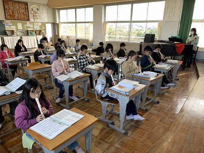 「もみじ」の上と下のパートの練習をしています。頑張って練習して、上手に吹けるようになった子もたくさんいます。守山先生のウクレレに合わせて練習をしています。