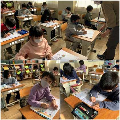 カタカナの練習をしています。今日は「ハ」「ウ」「エ」「マ」の練習です。