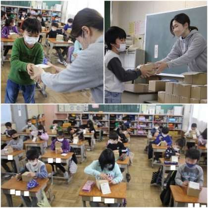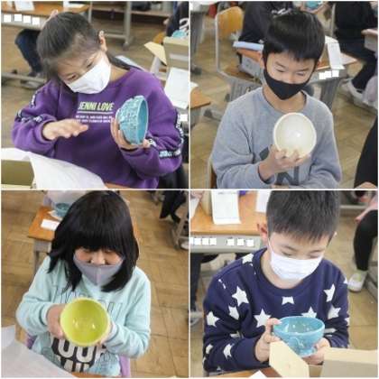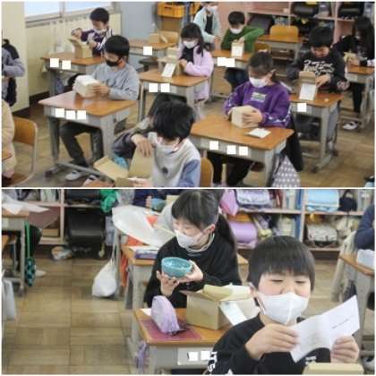 11月に作ったお茶わんが完成しました。みんなワクワクしながら、お茶わんをひとりずつ受け取りました。そして、いよいよ箱を開けてみると・・・・すてきなお茶わんが完成していました!お茶わんを手に取り、愛おしそうに眺める3年生の姿が印象的です。